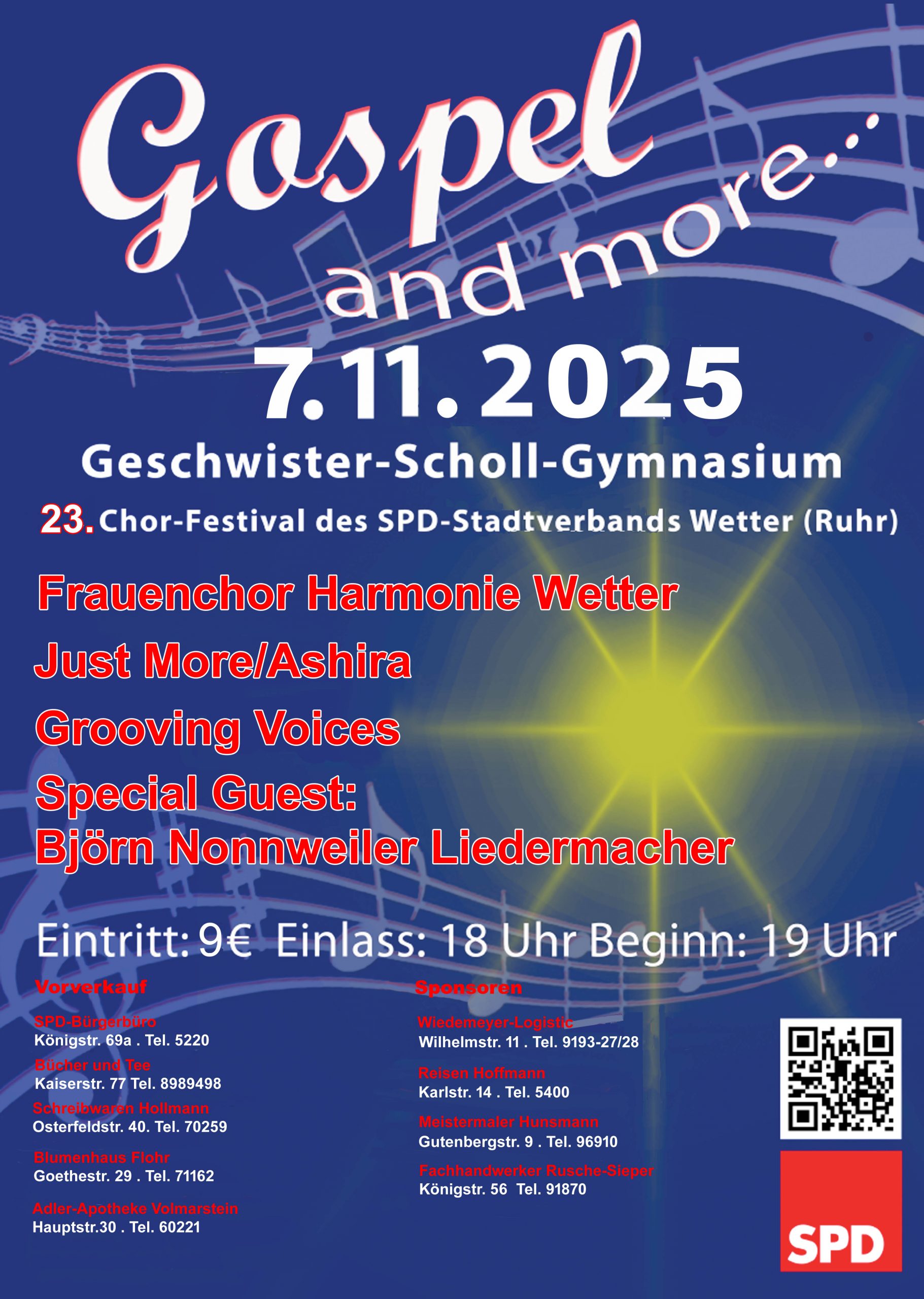 Zum 23. Mal veranstaltet die SPD Wetter ihr alljährliches Chorfestival „Gospel and more“ am 07.11.25 in der Aula des Geschwister-Scholl-Gymnasiums. Das Konzert beginnt um 19 Uhr, der Eintritt beträgt 9€. „Wir bleiben natürlich bei dem bewährten Grundkonzept, ein vielseitiges Musikprogramm von Gospel über Rock und Pop bis zum Musical zu präsentieren. Am Ende gibt es […]